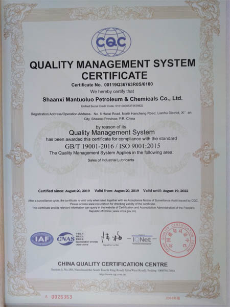 2019年8月,陜西曼陀羅石油化工有限責任公司通過了GB/T19001-2016/ISO 9001:2015質(zhì)量體系認證。為廣大新老客戶提供更規(guī)范、標準、優(yōu)質(zhì)的服務(wù)。